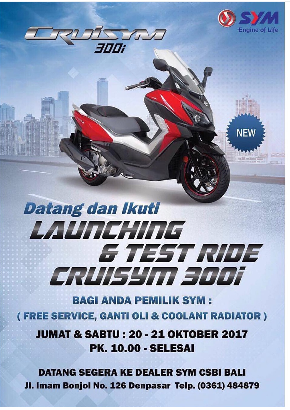 Naah kembali lagi ke berita utama.. SYM bakal merilis big skutik cruisym 300i tanggal 20-21 atau jumat sabtu mulai hari ini.. dalam acara launching tersebut juga ada sesi test ride nya dan bagi rider motor SYM bakal dapat ganti oli gratis, air coolant dan servis gratis…acara ini bakal di gelar dari jam 10 pagi hingga selesai..nah bagi masbro yang penasaran seperti apa sih cruisym 300i sang big skutik dari sym ini monggo langsung datang saja di kantor dealer sym bali jl. Imam bonjol utara sebelum lampu merah jl. Subur.