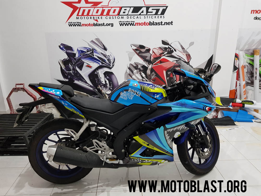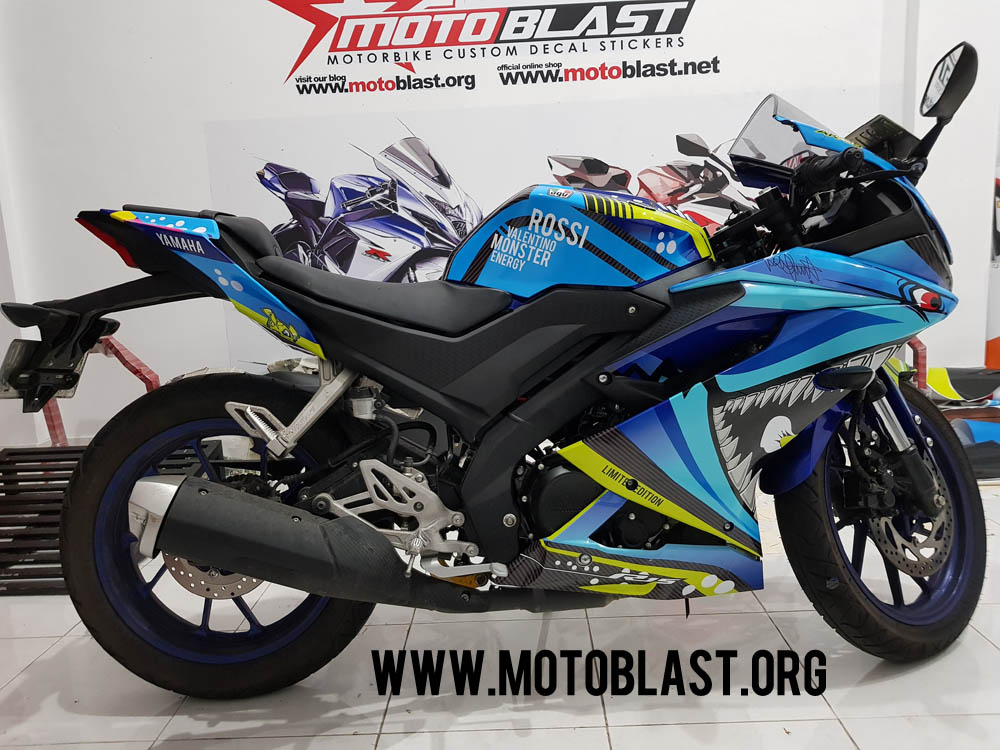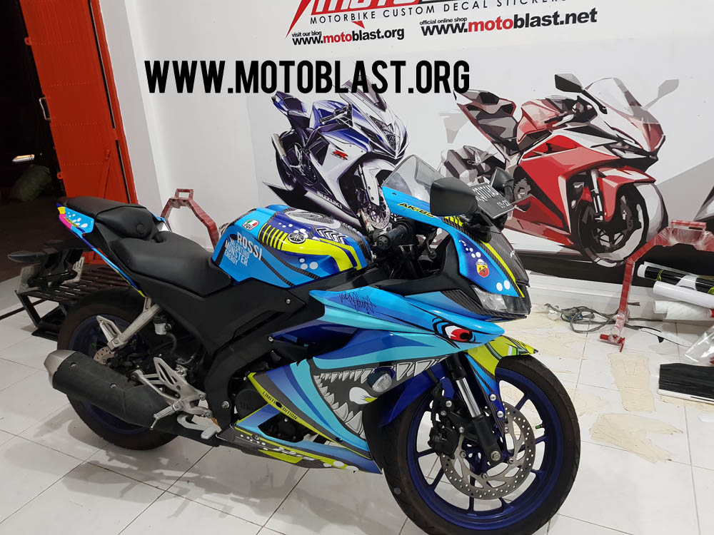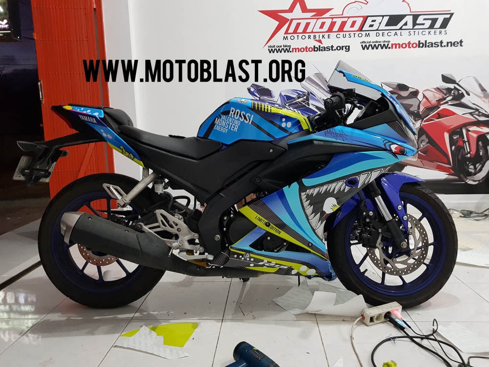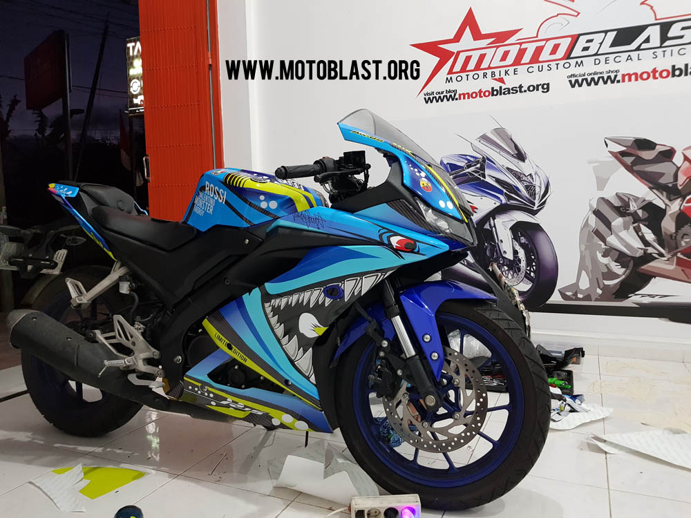 Motoblast.org – Tema Shark memang banyak diminati oleh para pecinta motor sport, terutama yamaha r15 v3 ini, karena tema ini sangat cocok dikarenakan ada contoh yamaha R1m memakai livery ini sangat garang dan klop, nah disini motoblast membuatkan decal stiker dan pasang sekaligus untuk new r15 v3 warna dasar biru yang kebetulan datang ke lapak.