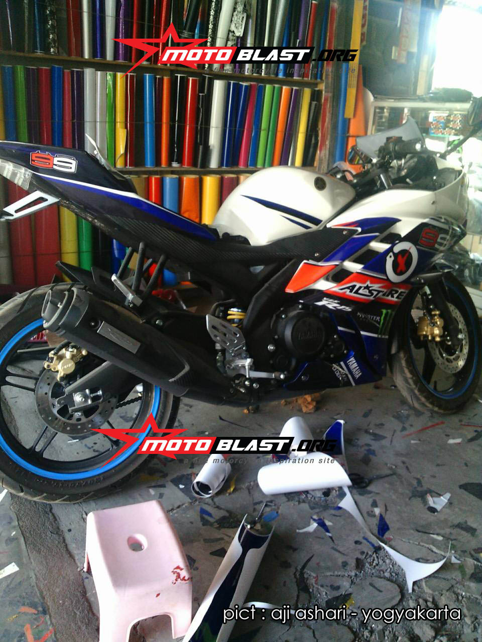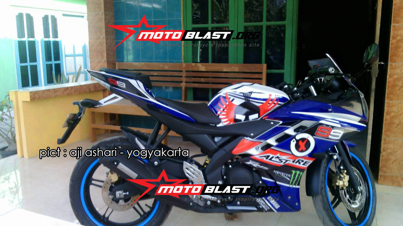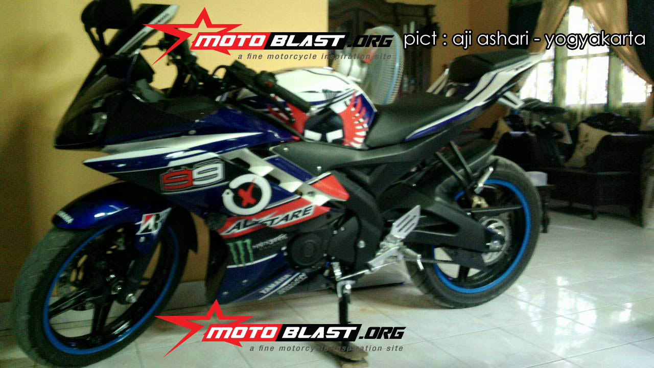 dengan tambahan logo alstare, monster energy dan logo standar yamaha, hemmm..kok jadi klop banget ya masbro..kesemsem nih motoblast dengan stripingnya..
