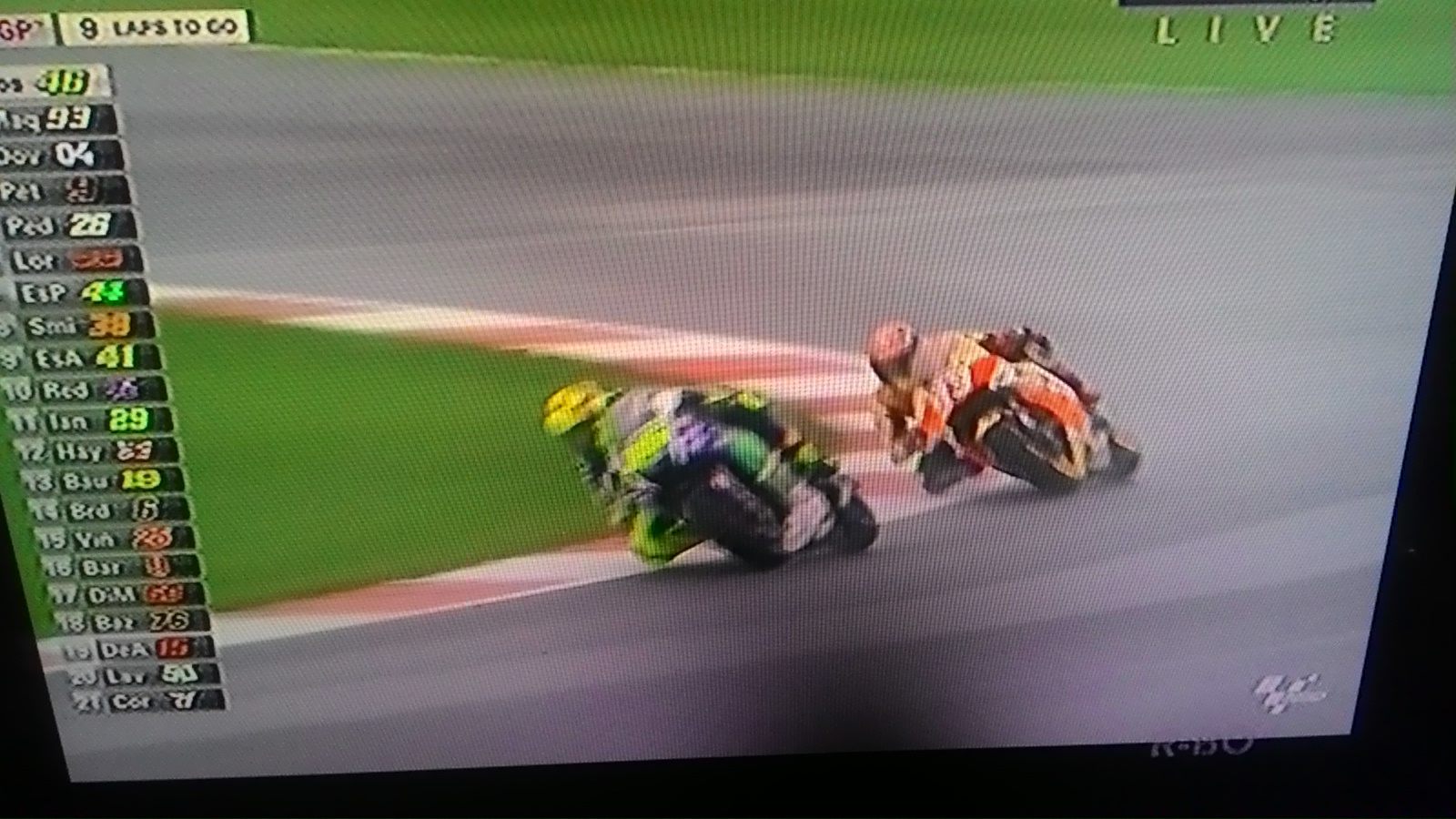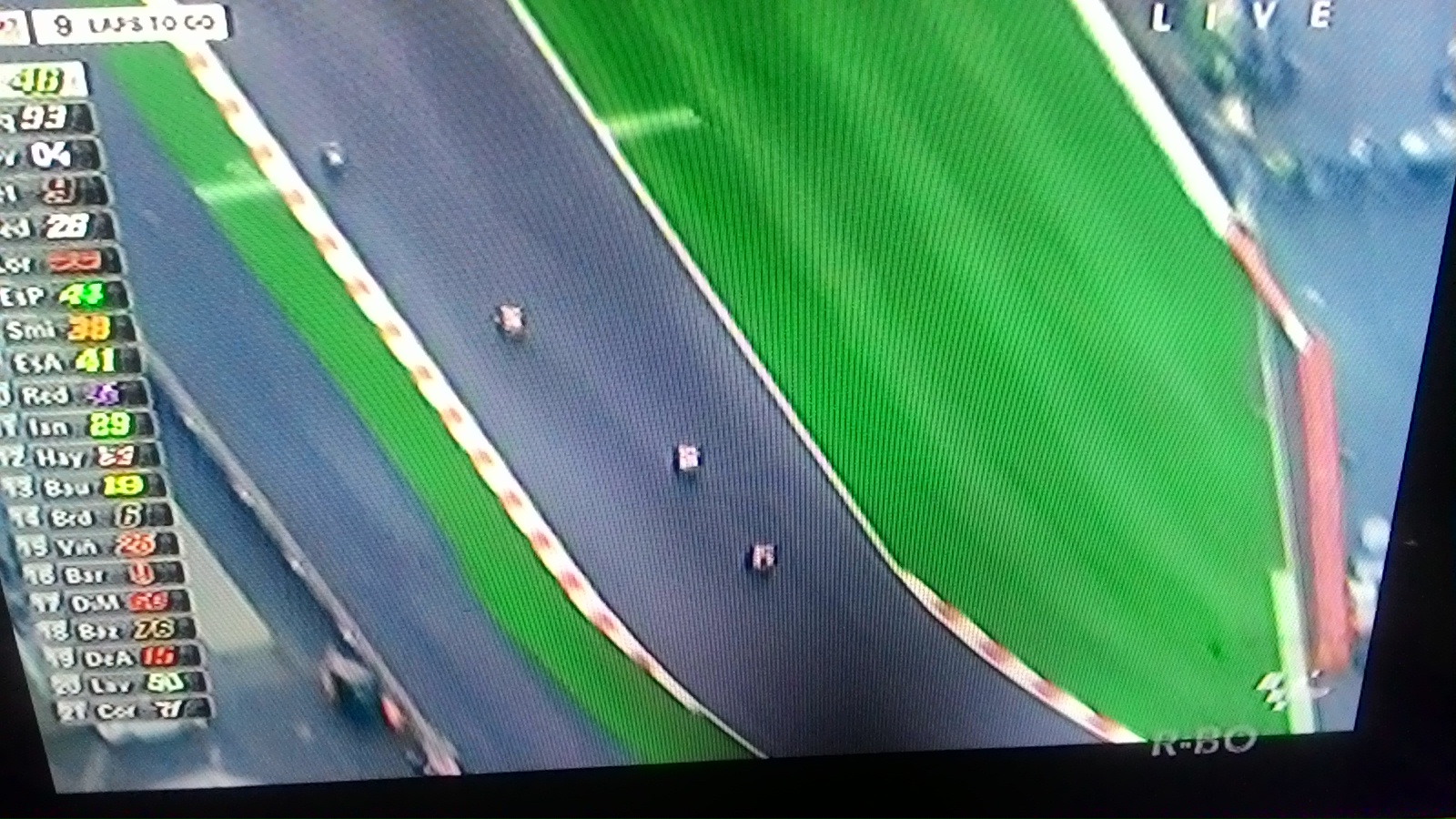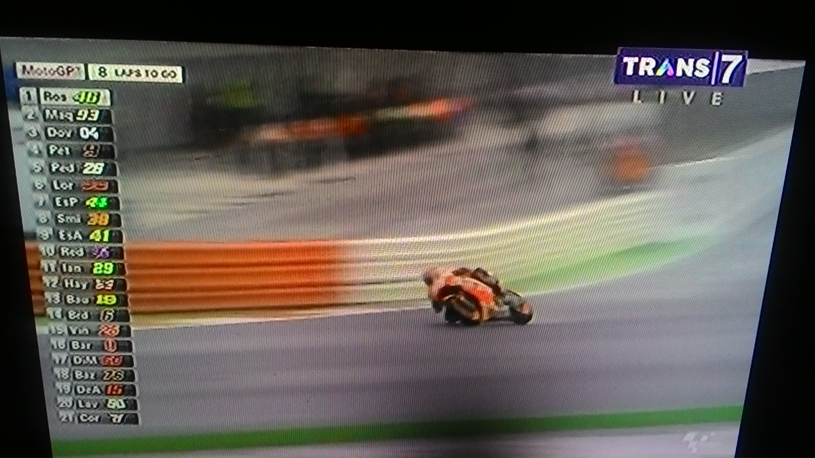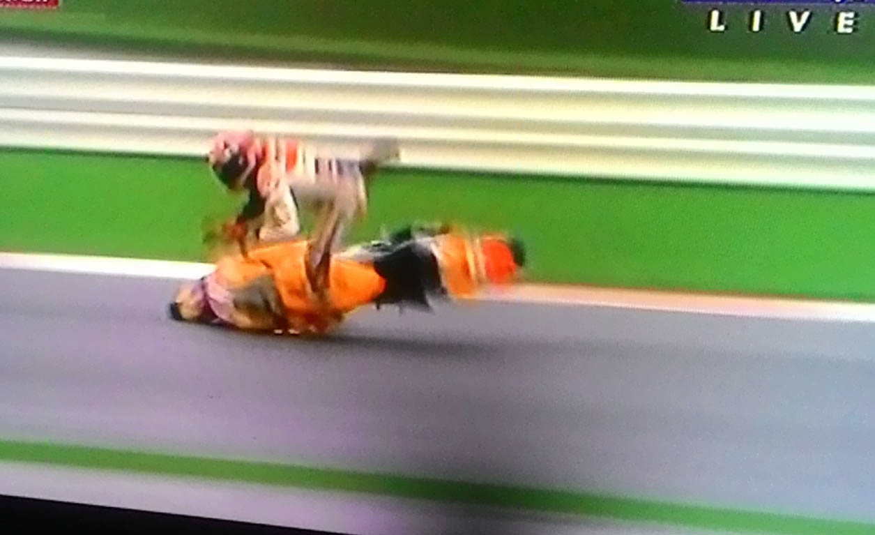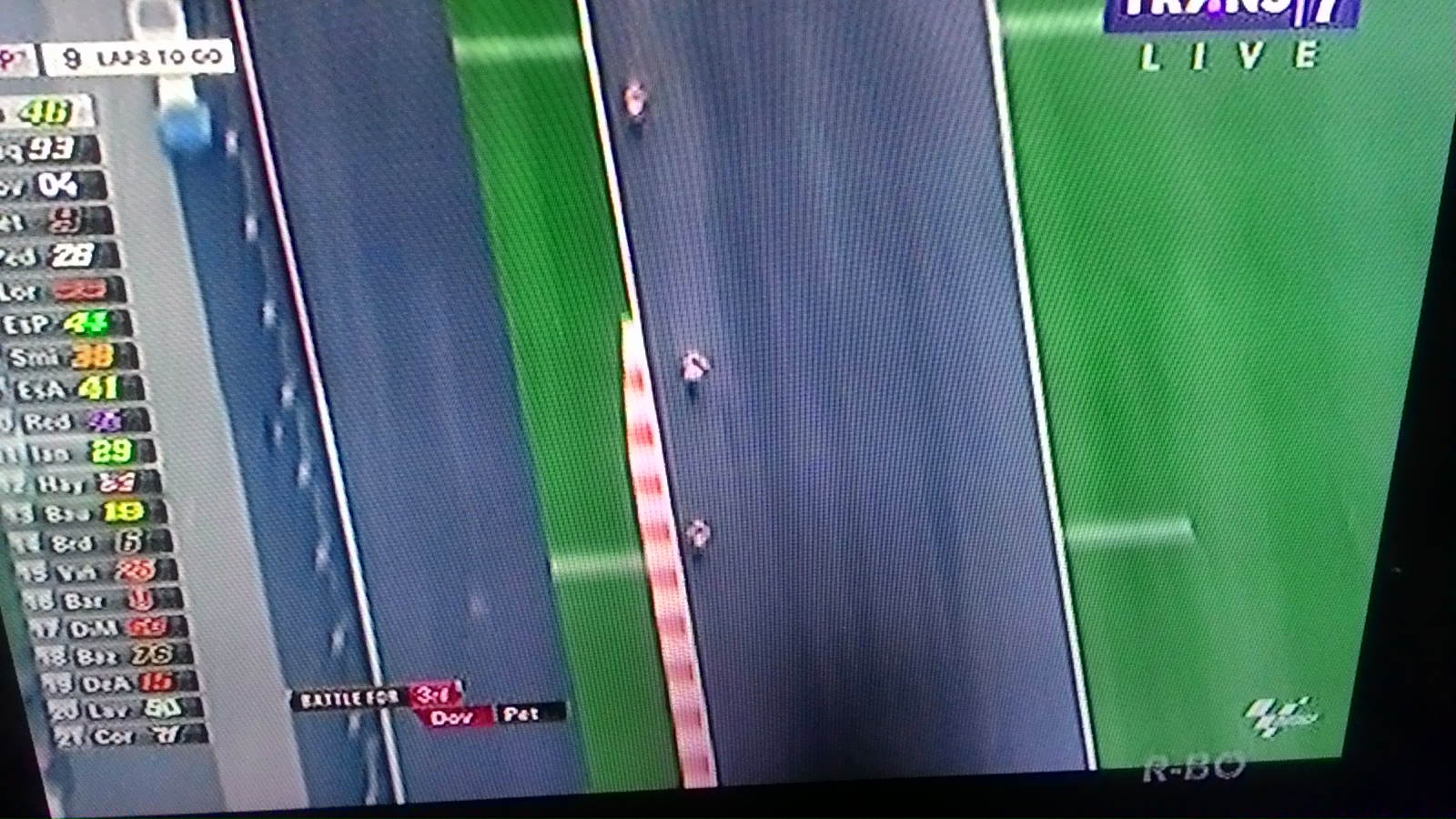 Namun beberapa race kemudian banyak kejadian yang mengakibatkan para rider jatuh bergelimpangan …duo ducati yang jatuh karena sliding satu tim nya….kemudian tak kalah seru adalah jorge lorenzo ternyata di salip oleh 2 rider sekaligus sehingga di posisi 5 dan dani pedrosa di belakangnya…