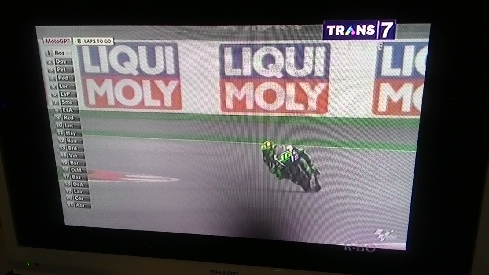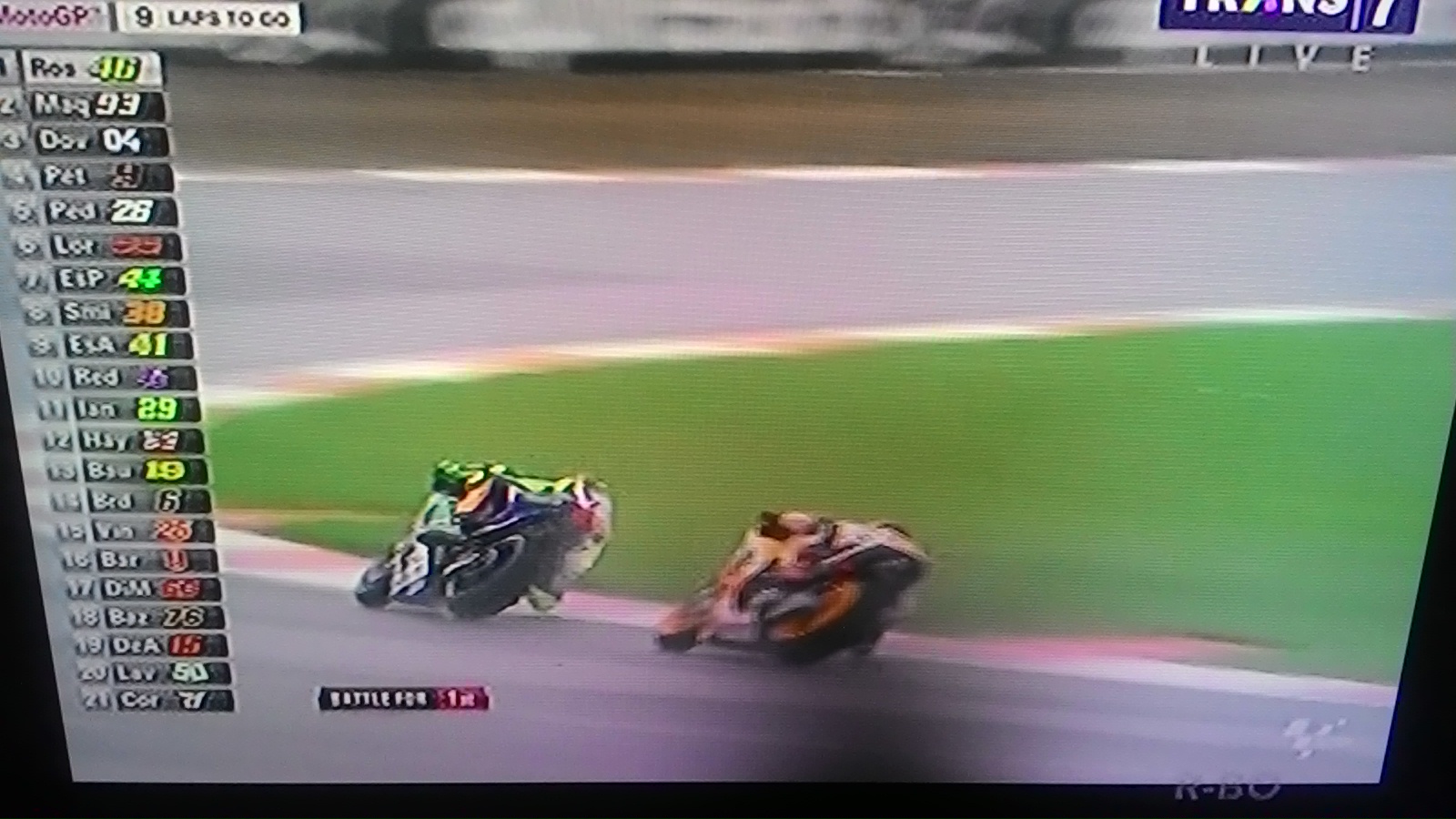 Namun sayangnya…. di lap 12 ( 8 lap to go).. marc Marques terjatuh alias crash..di karenakan pas nikung balik arah dia seperti terpental..kalo gak salah terlalu cepet untuk menukik ke arah berlawanan…wediaan tenan…sayang bangett oeeyy….setelah itu Rossi melenggang sendirian… sedangkan di belakang rider lainya terpaut cukup jauh di belakang…hemm..kayaknya V rossi juoss dan juga beruntung nih…kedudukan menjadi V rossi, Petrucci, Dovizioso, Jorge lorenzo kemudian Pedrosa ( 5 besar)…hasil yang tidak terprediksi adalah D Petrucci bisa naik podium..juoss tenan oey..padahal dovizioso terlihat begitu ngoyo untuk menyalip Petrucci..kesalahan telah di lakukan oleh Marques sehingga membuat dia terjatuh …