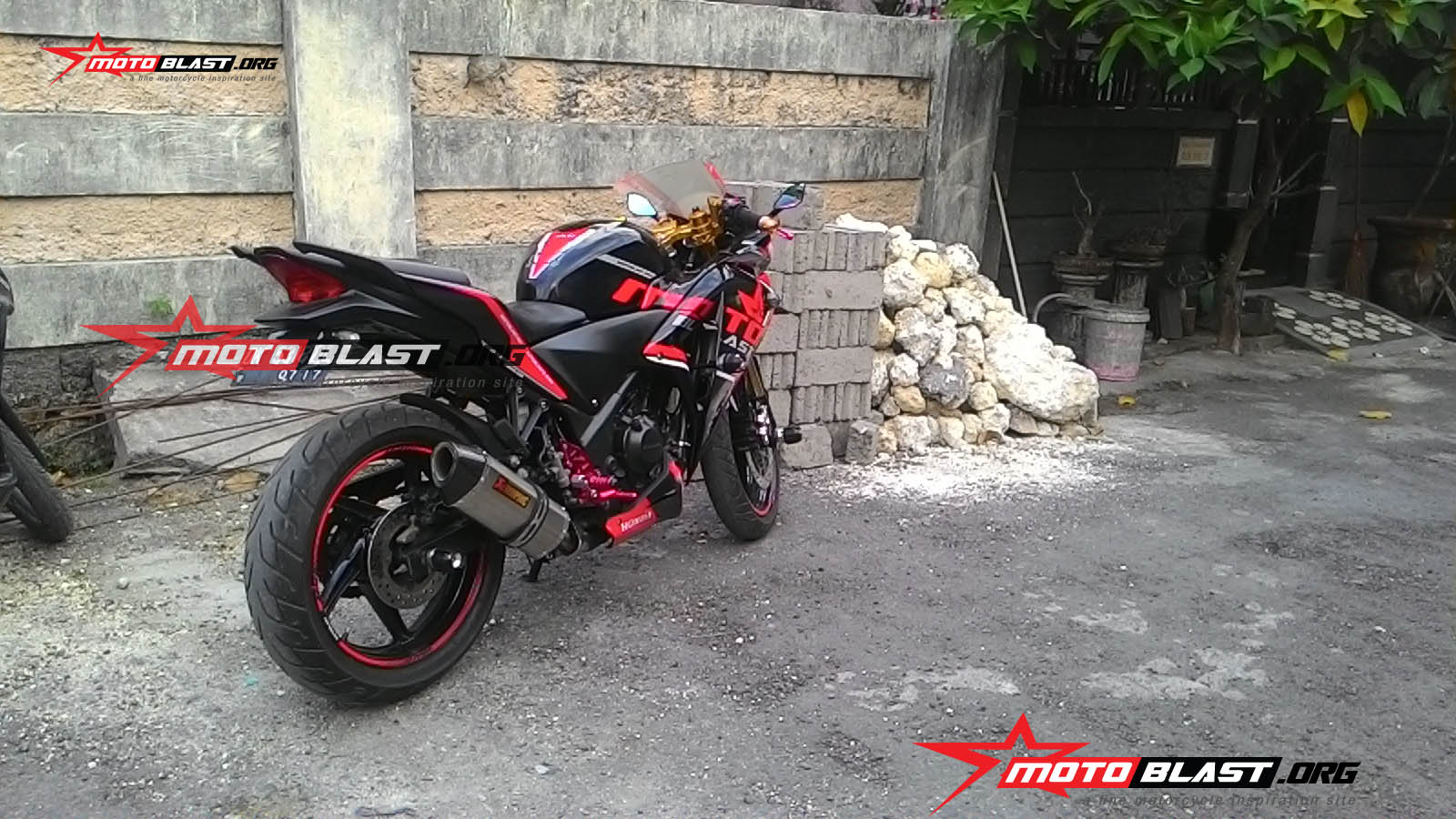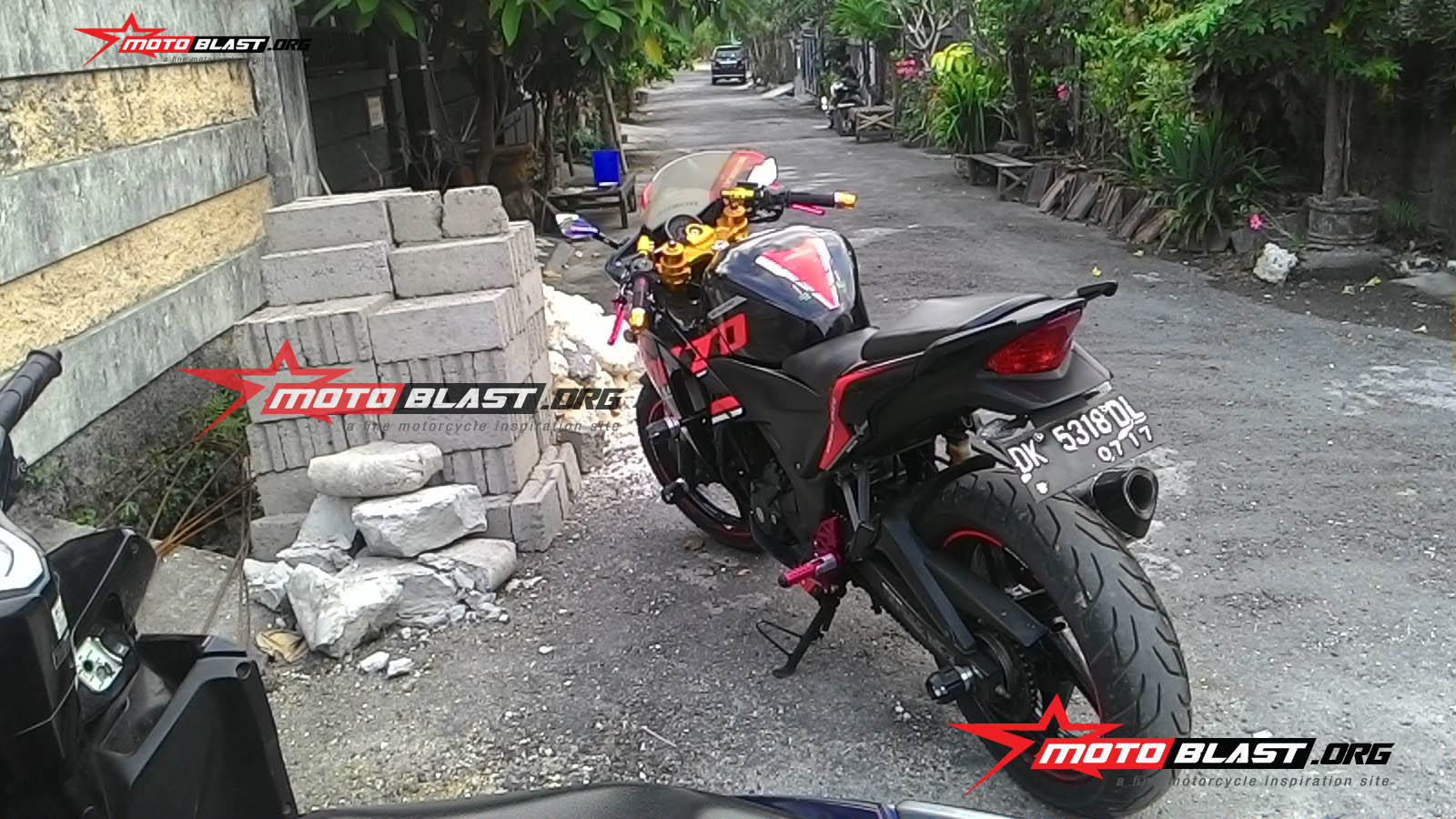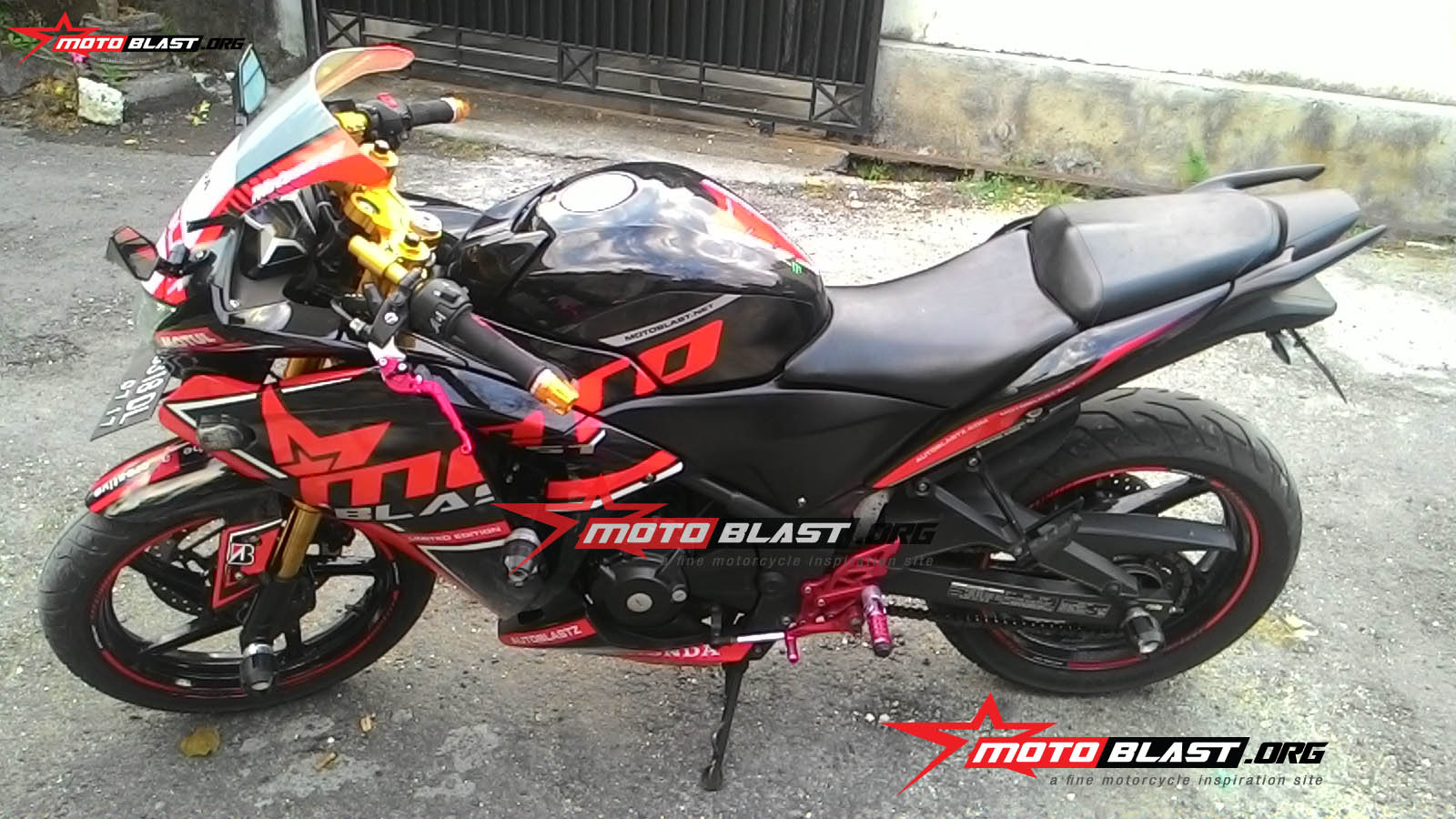 namun karena motor saya awalnya adalah hitam silver…maka saya pergi ke custom bike DR Painting dulu, di bali…dan berhasil deh di cat hitam keseluruhan…oke…setelah itu baru ke tahap decal..walaupun sebelumnya motoblast udah ubah2 nambah sedikit seperti shock depan pake USD Equinnox dan beberapa printilan asesoris kecil lainya…as roda, frame slider, pelindurng kaliper rem depan, ..naah mau tahu hasilnya kayak apa sih kalo nempel di motor saya..berikut gallery nya..hahaha