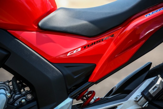 Untuk suspensi depan masih menggunakan teleskopik konvensional sebesar 130mm dan belakang monoshock 108mm, untuk velg sendiri menggunakan model palang 5 model Y miring dengan dibalut ban depan sebesar 110/70-17 dan belakang 140/70-17 ban pirelli diablo rosso di bagian belakang. untuk motor cb twister 250 ini juga udah di lengkapi tipe pengereman ABS. untuk bagian depan disk brake berkaliper 27m mm dan belakang 220mm tunggal.