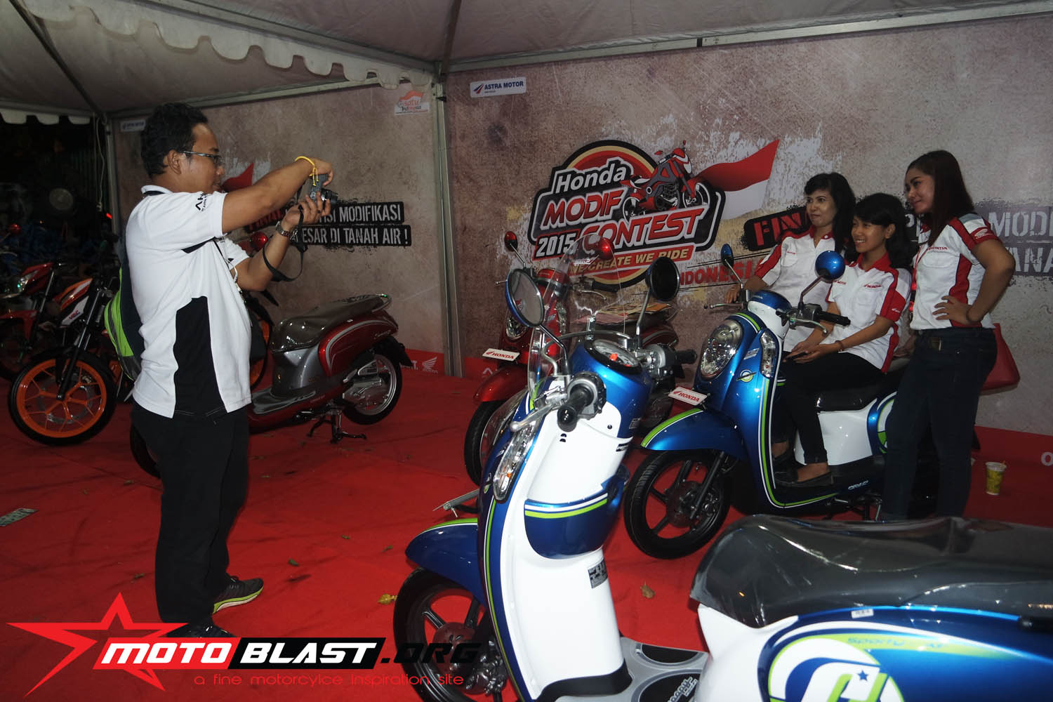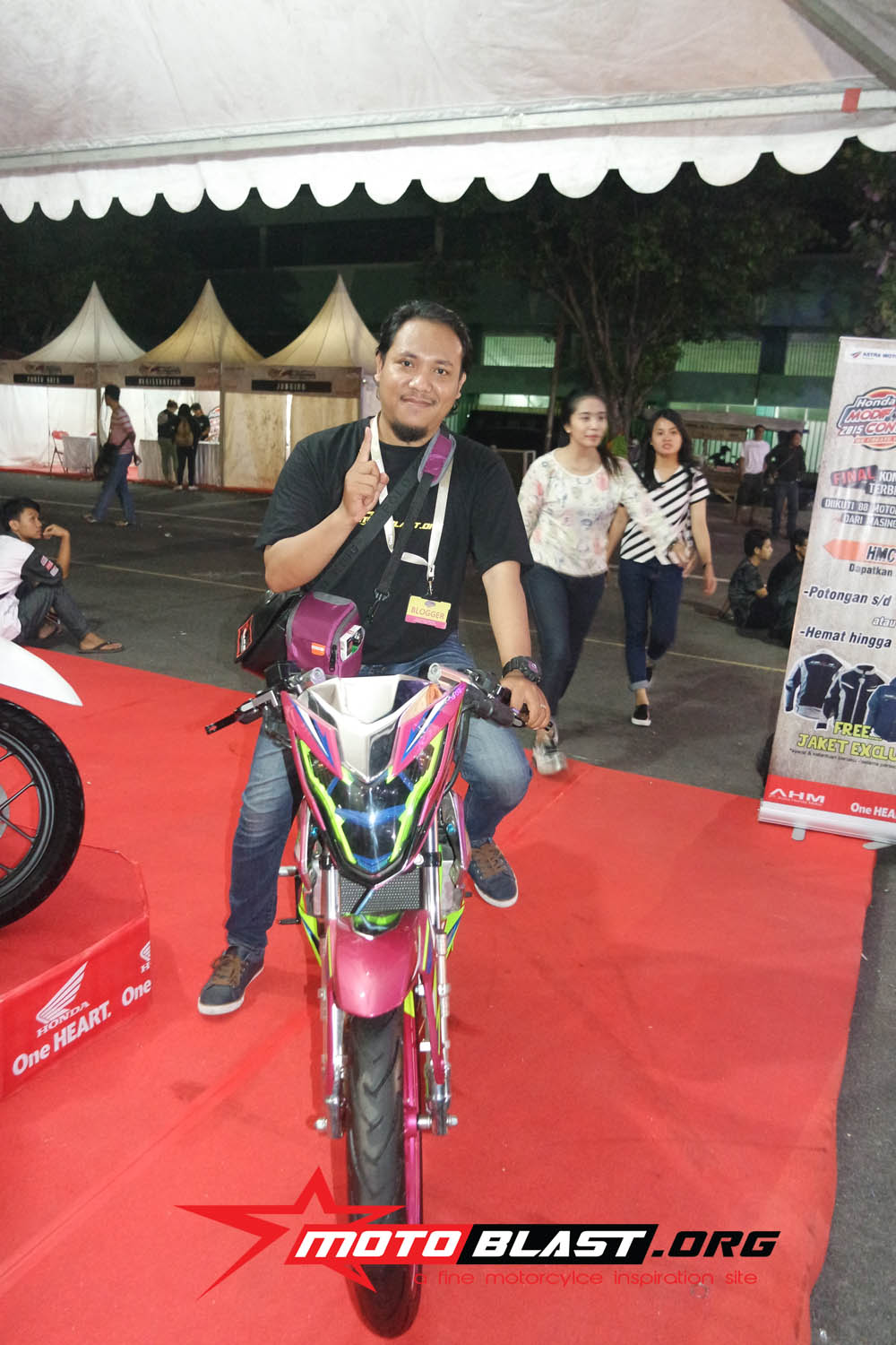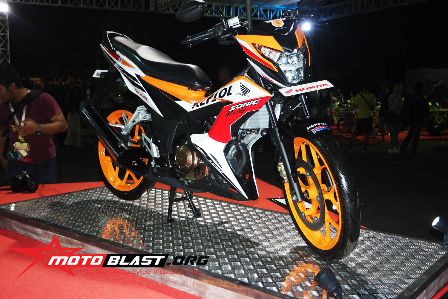 Halo mas dab..seperti yang sudah motoblast beritahu waktu lalu, bahwa acar Honda Modif Contest 2015 di jogjakarta kemaren tepatnya di stadion mandala krida , bertepatan dengan launching secara resmi Honda SOnic Repsol editoin,..dan juga launching facelift dari honda scoopy tambahan warna baru yang lebih muantapp