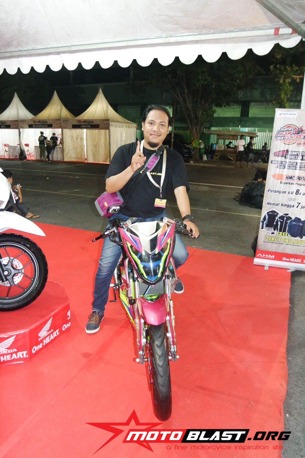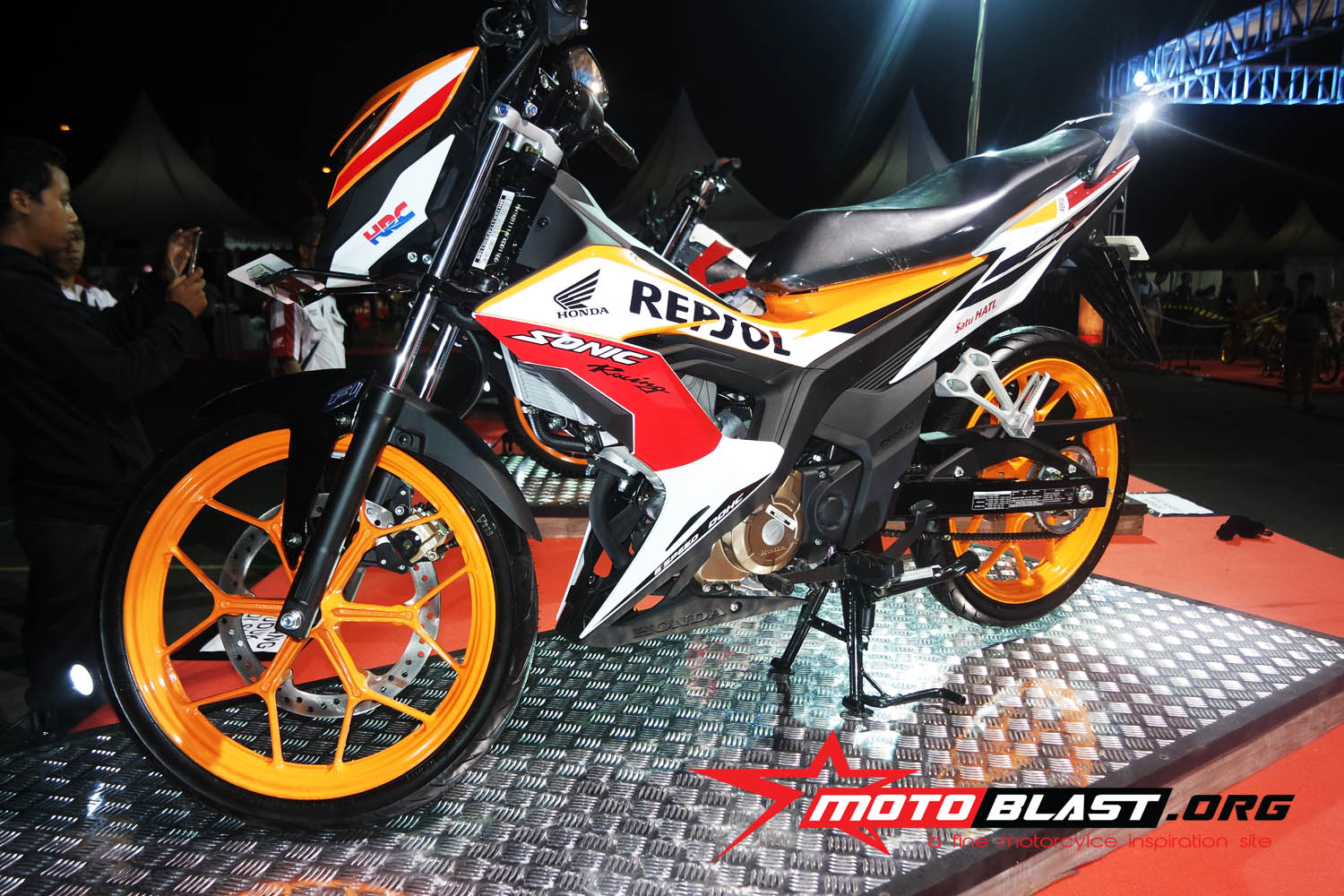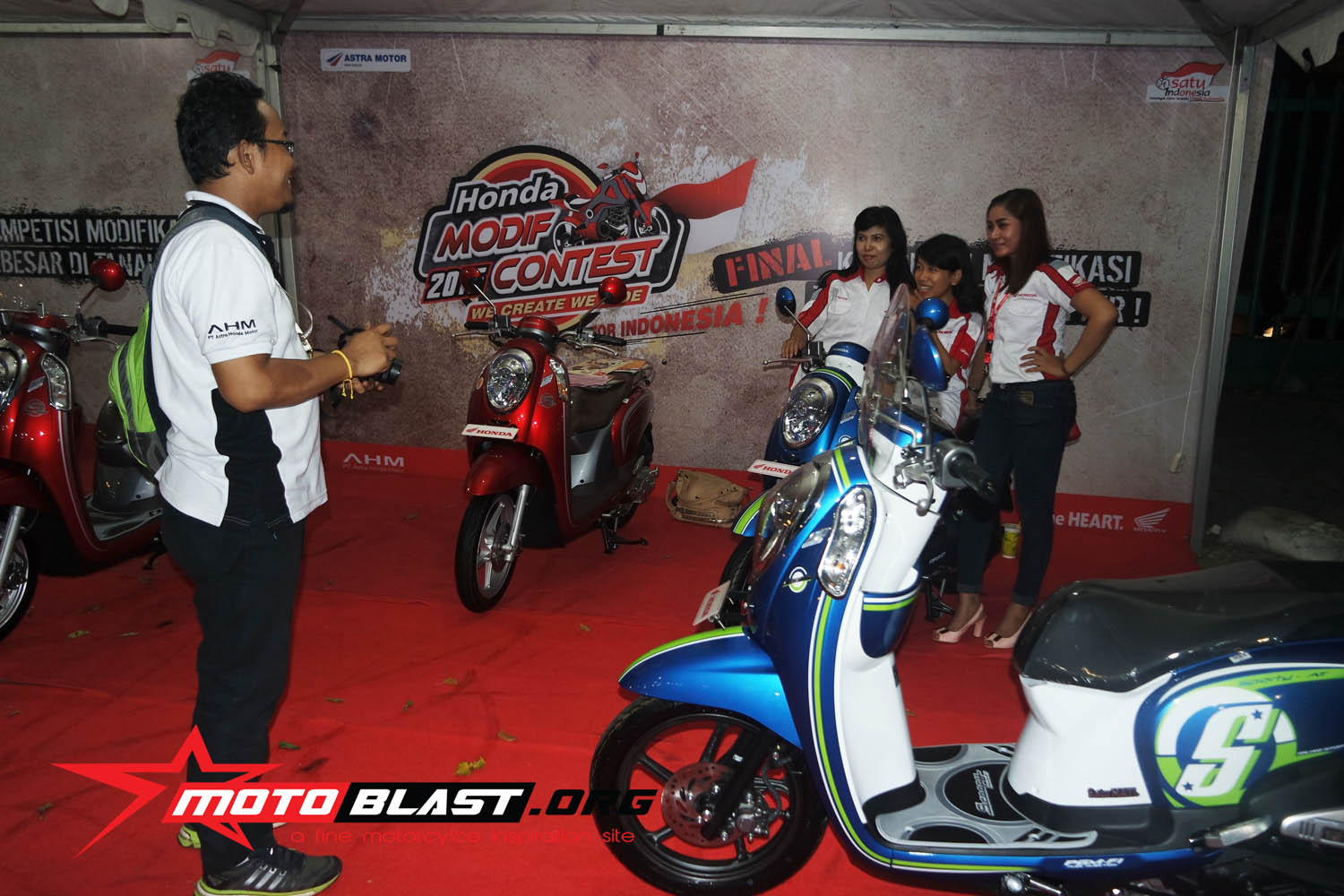 Halo mas dab..seperti yang sudah motoblast beritahu waktu lalu, bahwa acar Honda Modif Contest 2015 di jogjakarta kemaren tepatnya di stadion mandala krida , bertepatan dengan launching secara resmi Honda SOnic Repsol editoin,..dan juga launching facelift dari honda scoopy tambahan warna baru yang lebih muantapp