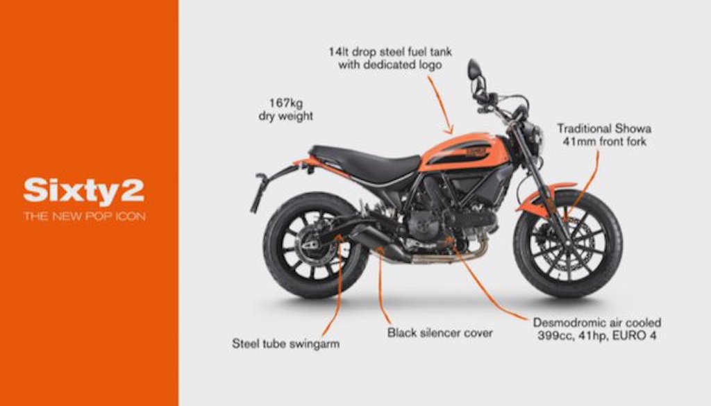 Ducati secara resmi merilis Scrambler sixty 2016 di EICMA Motorcycle show di milan, dengan varian terkecil dari pabrikan ducati, scrambler sixty2 ini merupakan versi terusan dari scrambler 800cc, namun begitu scrambler sixty2 mendapatkan sentuhan warna yang sangat energyc. kekuatan dari sixty2 adalah 399cc berpendingin udara, desmodromic euro4 dengan power 41hp, untuk ukuran garbu sendiri mengandalkan dari Showa dan berkaliper 41mm, swingarm dari baja, knalpot model pendek, dengan berwarna hitam, serta tangki berukuran bahan bakar 14 liter, dengan berat yang cukup karena 167kg.