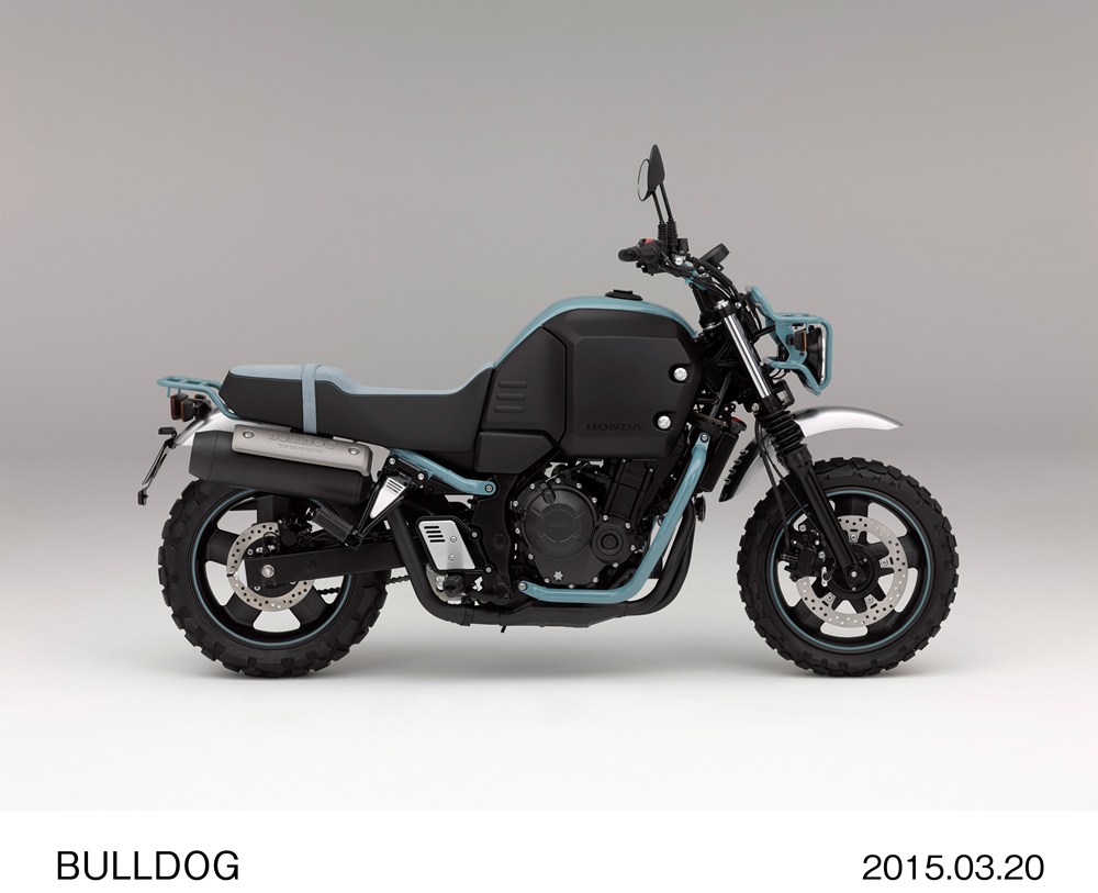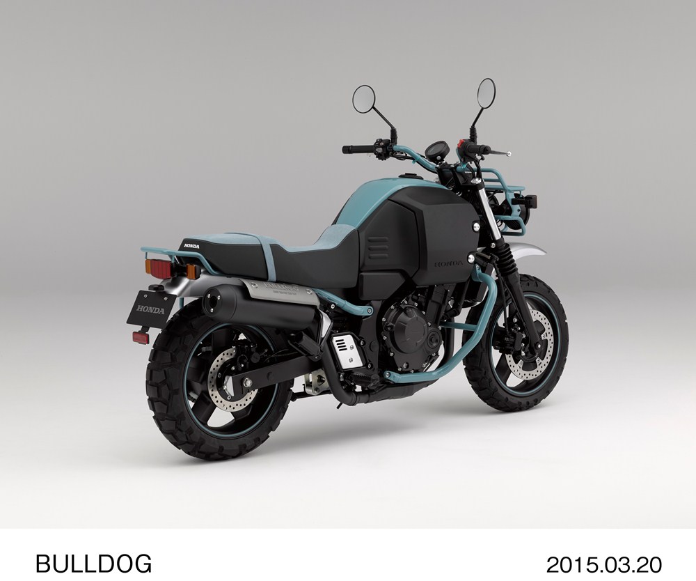 Seperti kita tahu bahwa Konsep Bulldog adalah konsep yang pernah di tampilkan di jepang dengan konsep yang sudah matang. motor berkonsep bullbog ini katanya akan berbasis mesin honda CB400F dimana motor yang secara fisik sangat identik dengan CB500F hanya saja dengan cc mesin yang lebih kecil karena terkait penyesuaian undang undang perizinan lokal jepang.. naah mengenai modelnya sendiri menganut yang tak begitu jelas, namanya bulldog konsep, seperti motor motor yang bergaya petani nih masbro ya.. dan juga sedikit kearah motor touring, motor petualangan namun dengan ban yang lebih gambot dan kayaknya cocok untuk jalanan yang off road