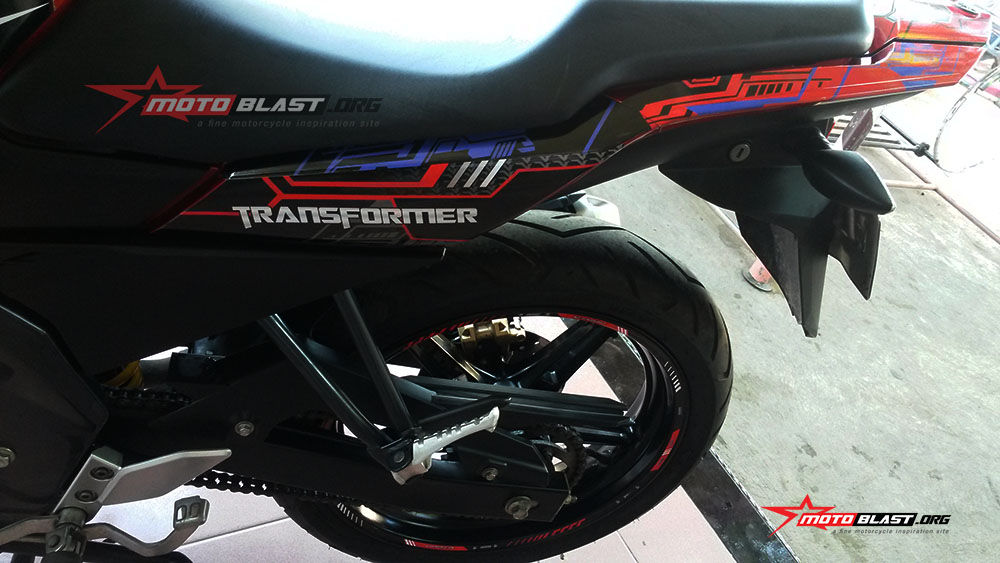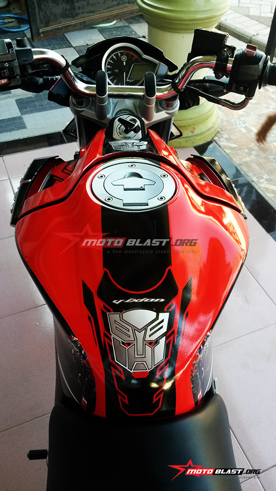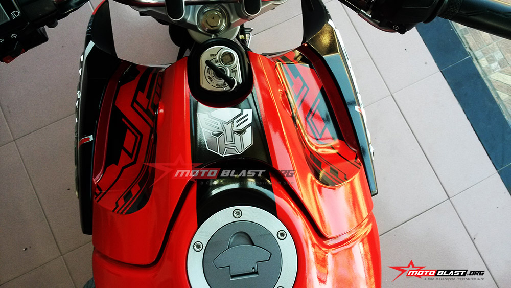 dikarenakan fullbody, sampai pada cover tangki pun yang cekung kedalam tetap ketutup sempurna dengan decal motoblast, so merah di tangki gambar diatas bukan cat lagi, tapi merahnya dari stiker loh, dan alhamdulillah, ketika di bawa kemana mana, jadi perhatian di kampung, karena belum pernah ada, hehehe… dan pesanan pun mulai banyak dari teman teman kakak saya dan tetangga sekitar, oalah.. berkah anak sholeh.. 🙂