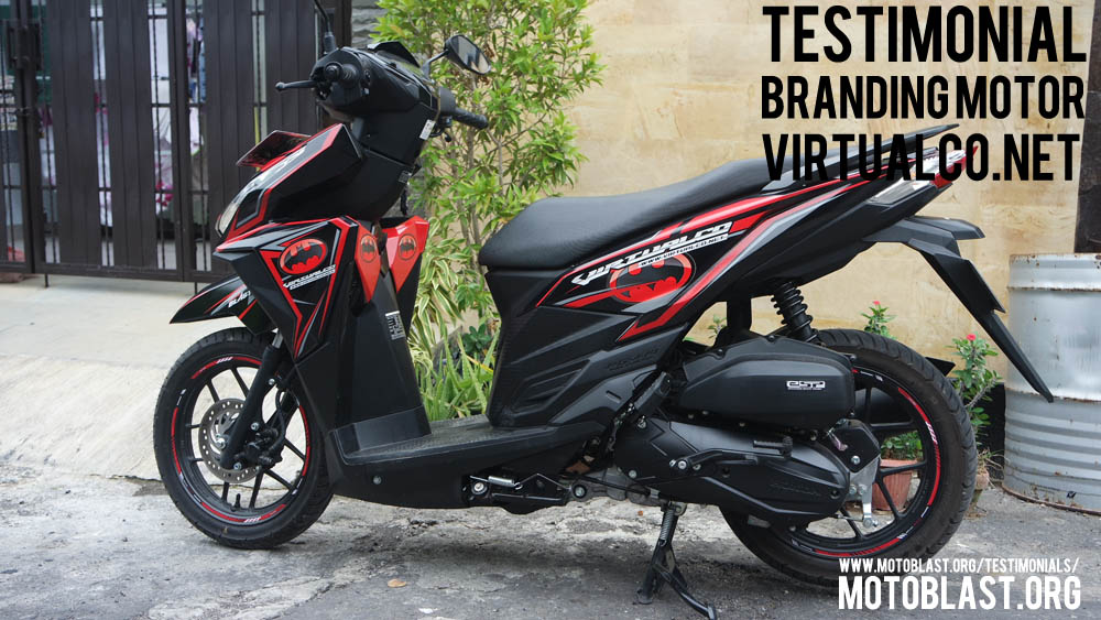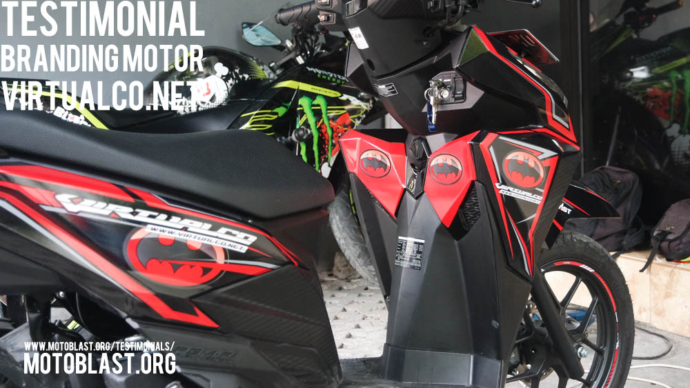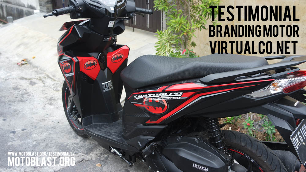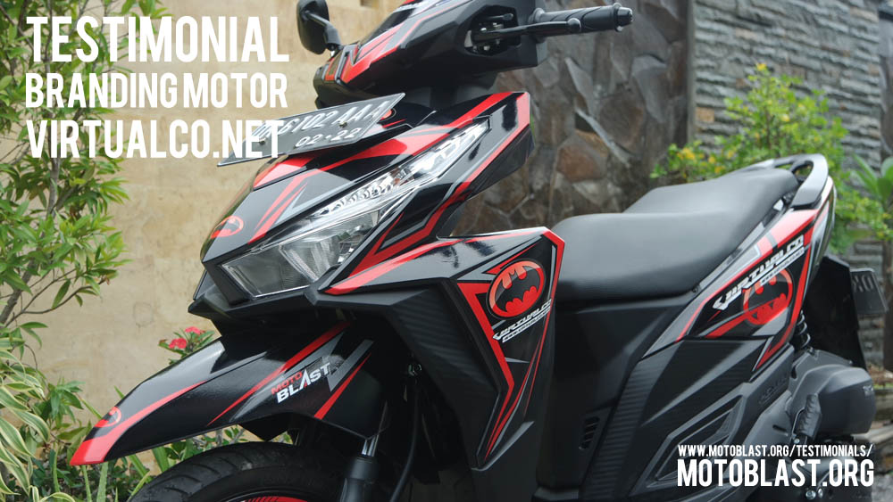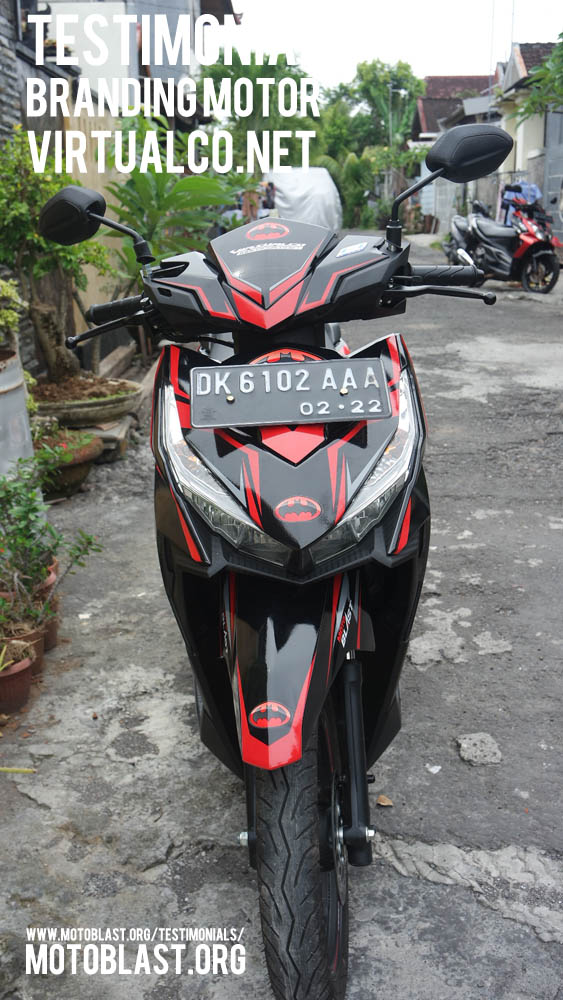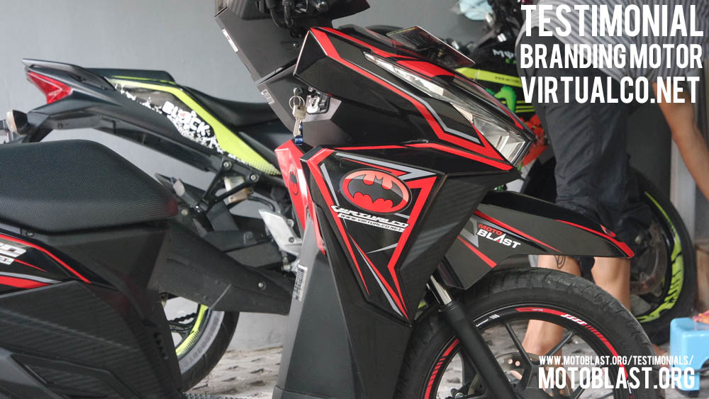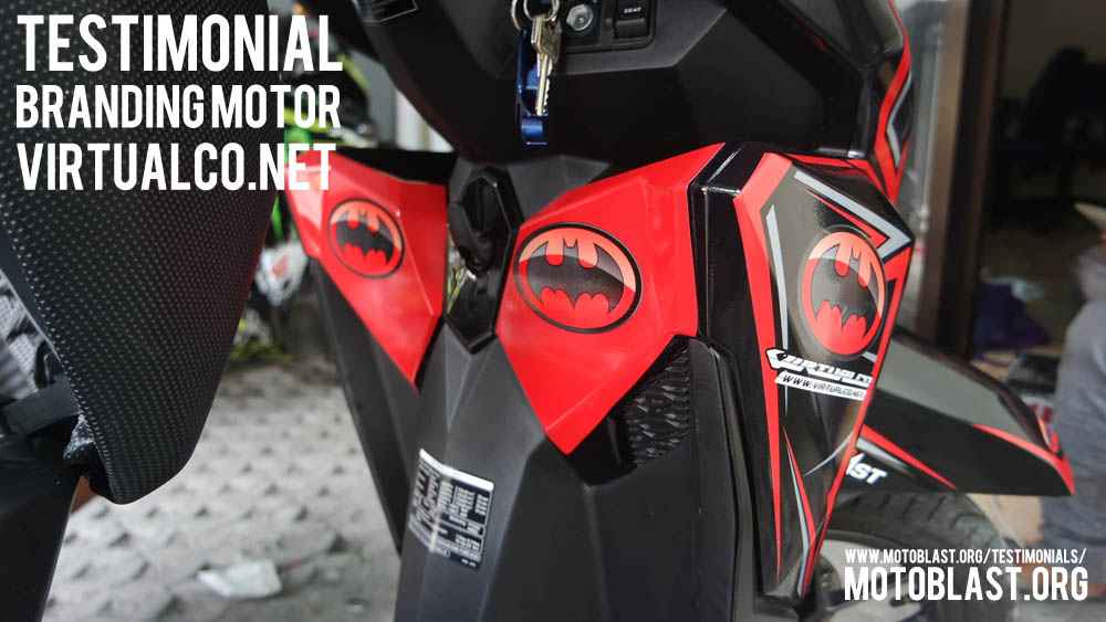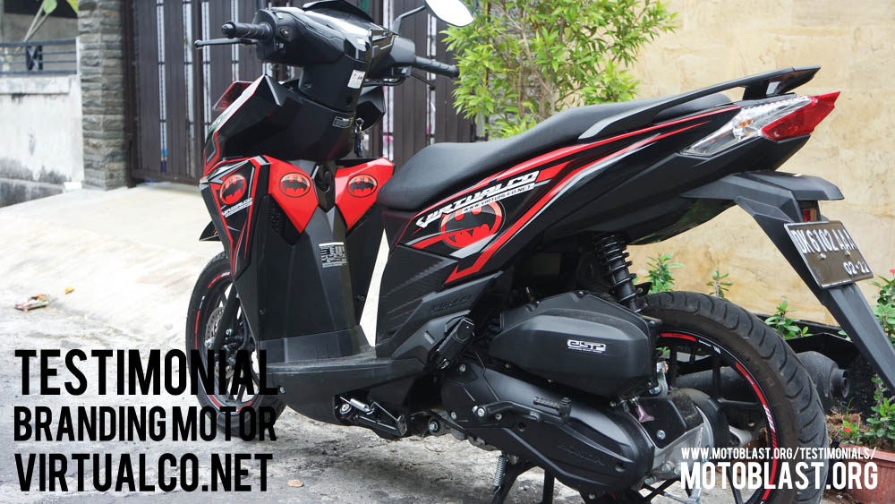 Dan ketika kemarin setelah masbro satu ini yang baru memiliki motor vario 125 Esp, karena tahu motoblast memiliki usaha kecil kecilan di bidang decal stiker akhirnya mempercayakan branding motor matic nya di motoblast dengan tema batman warna merah namun harus ada tulisan dari nama usahanya yaitu virtualco, yoi.. wesss langsung oret oret dan begitu selesai langsung pasang di lapak motoblast