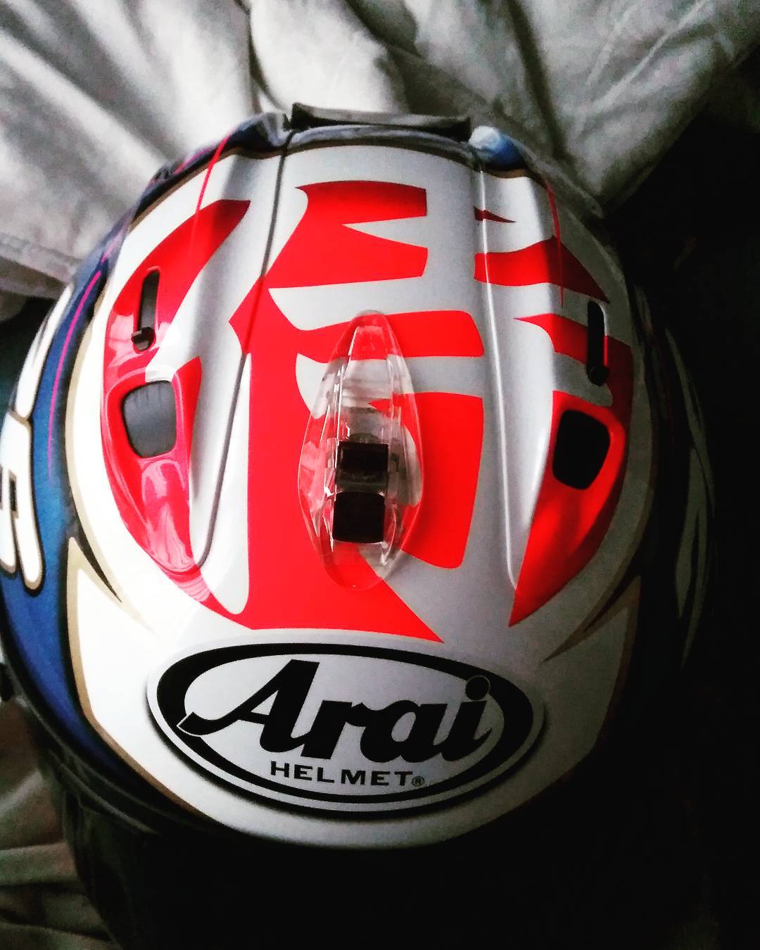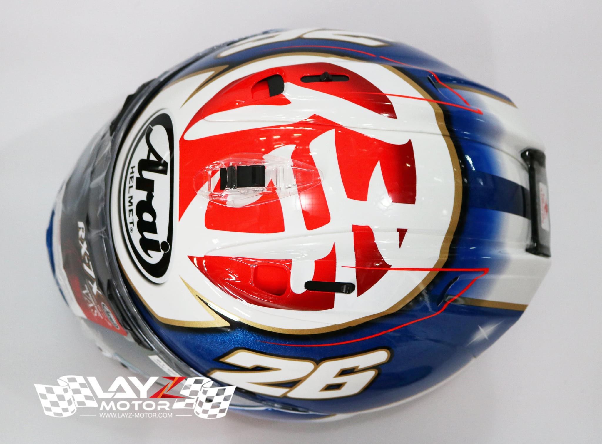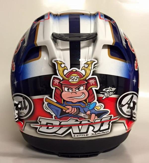 Naah untuk itu akan di miripkan ke body honda new cbr250rr yaitu mulai bertuliskan jepang yang melingkar itu di letakkan di fairing samping kiri kanan dan gambar little samurai dengan tulisa Dani dan seorang samurai yang memakai topi bertuliskan nomor 26 nomer asli dari dani pedrosa.. dan menurut informasi ini adalah helm arai very motegi 2015. dan kombinasi warna nya adalah biru, hitam putih dan merah.. namun karena di letakkan di body motor cbr250rr warna merah, maka yang di pakai adalah hitam dan putih, birunya tidak di masukkan