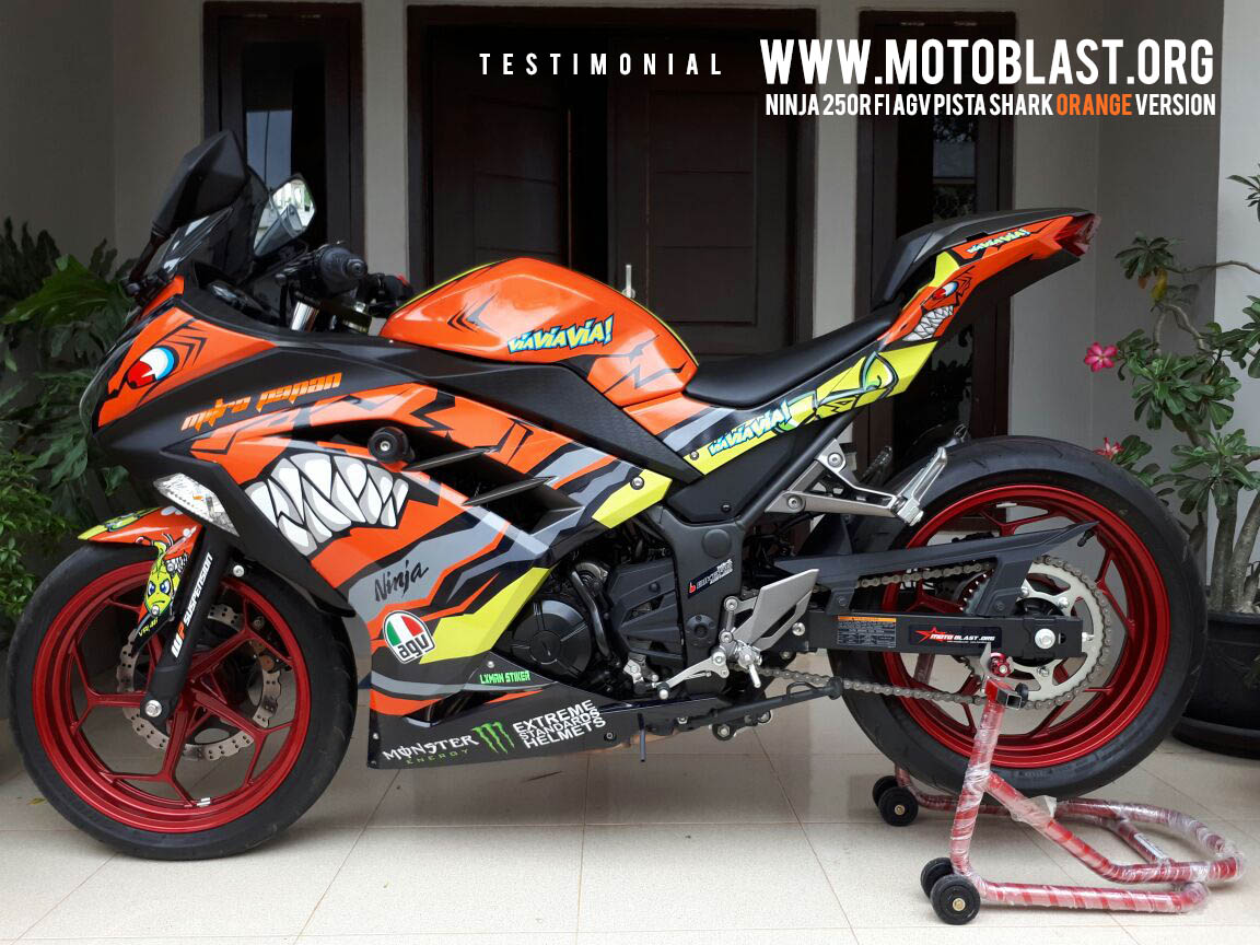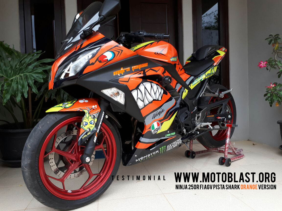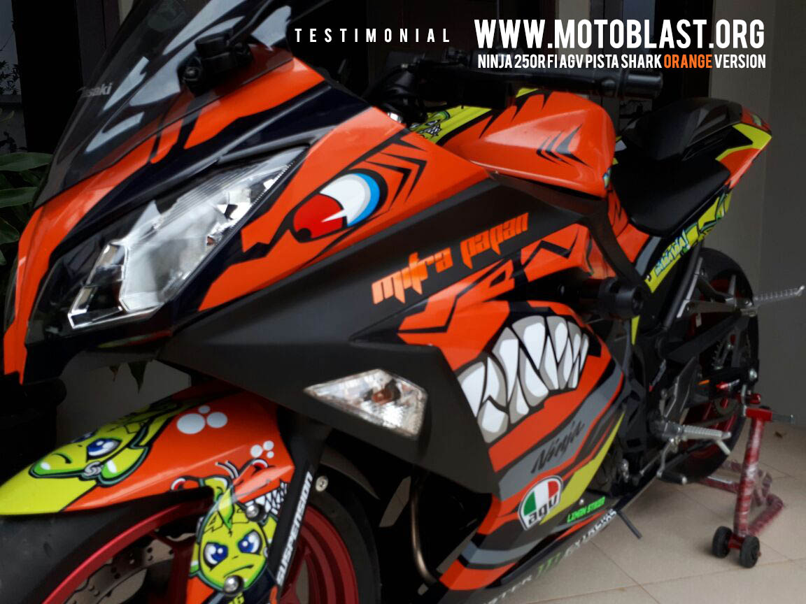 Halo mas dab.. pagi pagi sudah di wa oleh konsumen motoblast asal kediri jawa timur yang sebelumnya memesan stiker decal untuk motornya ninja 250r fi tema agv pista shark orange version dan telah di kirim hasil nya.. wes mrongoss tenan iki