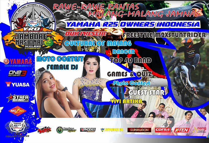 Kami mengundang tim khusus profesional free style dengan mengendarai motor jenis R25 sebagai hiburan yang berkualitas, saat pelaksanaan puncak acara di Taman Krida – Malang