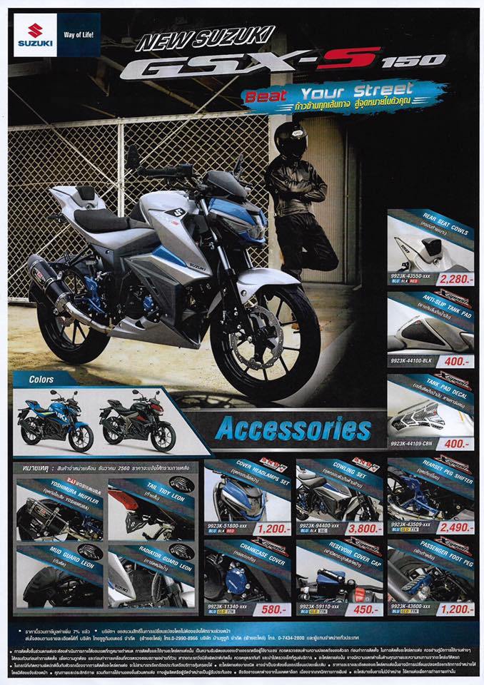 Bukan itu saja suzuki thailand langsung menyediakan asesoris seperti single seat , topeng headlamp yang membuat menjadi lebih terlihat robotic dan lebih garang dan juga asesoris speed lainya seperti knalpot, undertail, footstep racing, tank pad, pijakan kaki boncenger custom, tutup crankcase, tutup oli rem dan lain sebagainya..