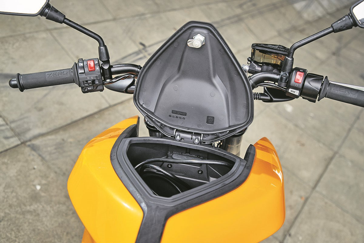 Uniknya Zero S ini memiliki ruang ditangki atas yang bisa di buka yang bisa di pakai sebagai bagasi dan berhemat hingga 43 kg bobotnya. woww. Motor listri Zero S ini bisa di pakai hingga 50 – 70 mil pemakaian sebelum baterai harus di cas ulang.