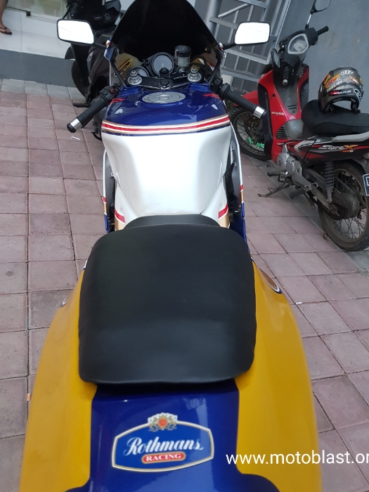 Back to the point..motor honda RVF 400 V4 ini arm belakang sudah pro arm jadi menambah keren nya..walaupun bentuk jadul tapi speknya broo..bikin ngiler..shock usd nya pun berukuran besar dan underyoke…panjangnya tangki membuat motoblast saat jajal naik di atasnya menjadi membungkuk banget maklum tinggi badan cuma 160cm..dan alhasil kaki jinjit balet..coba aja liat fotonya..haha…