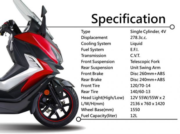 Cruisym 300i ini memiliki spek mesin 278,3 cc silinder tunggal dan memiliki power 26.7tk dan torsi 27.3nm. Cukup untuk big skutik 300cc dengan desain gambot..