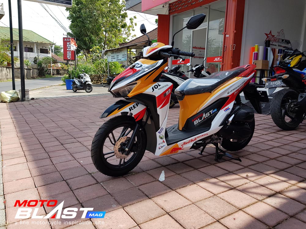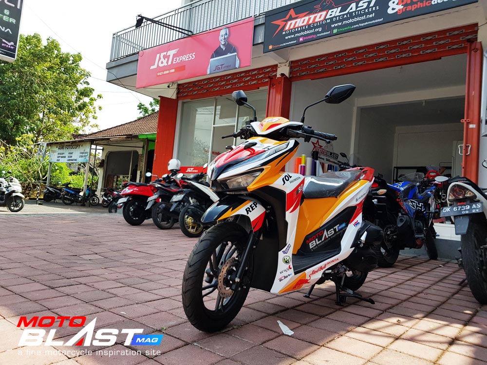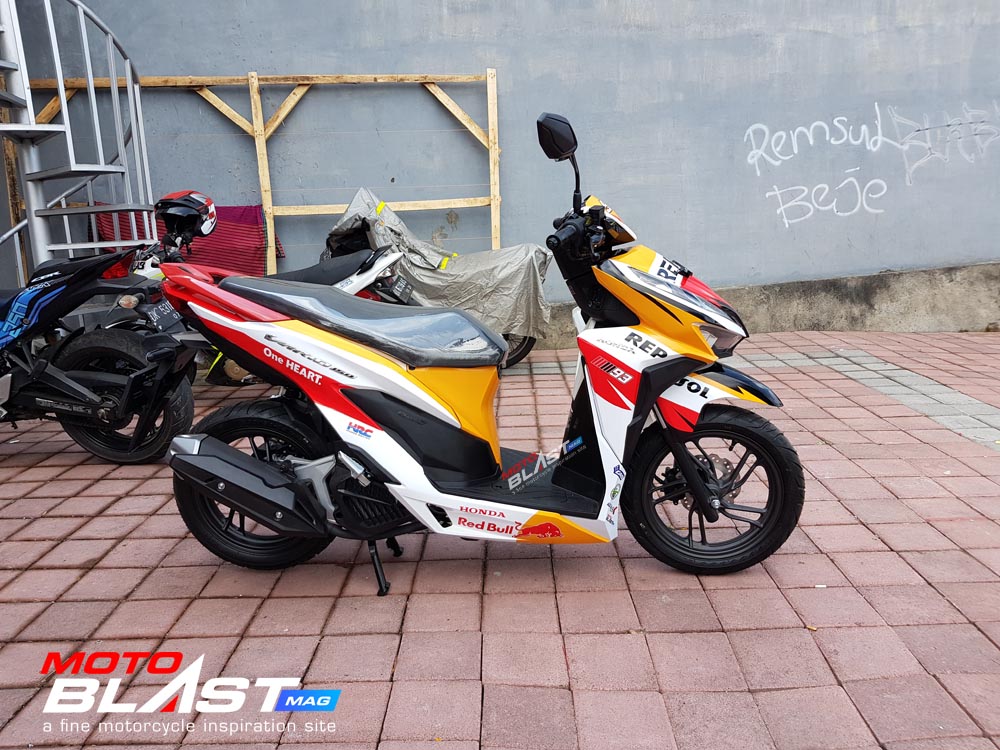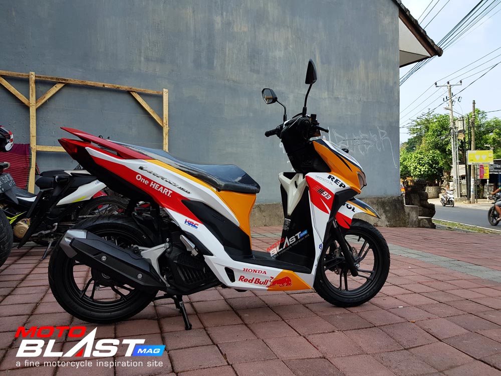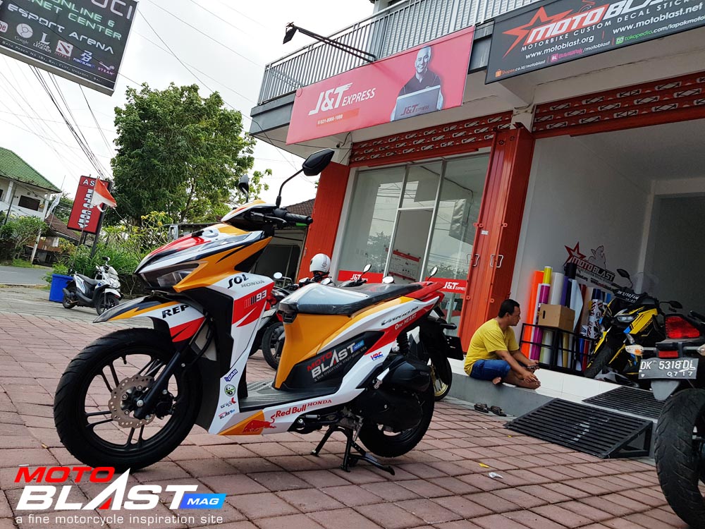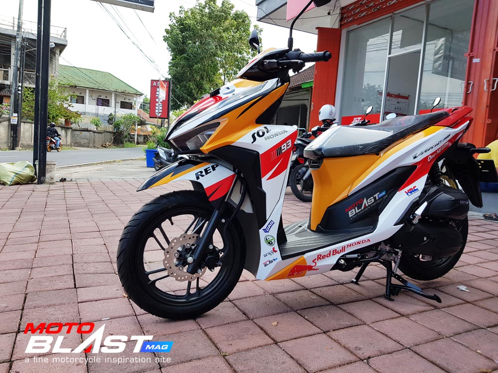 Halo mas dab.. kali ini motoblast mau share sebuah motor Vario 150 terbaru 2018 warna dasar putih yang di decal stiker livery Repsol buatan motoblast yang merupakan request dari konsumen motoblast yang langsung mengirimkan motornya ketika baru keluar dari dealer, langsung bro gak pake mampir ke empunya