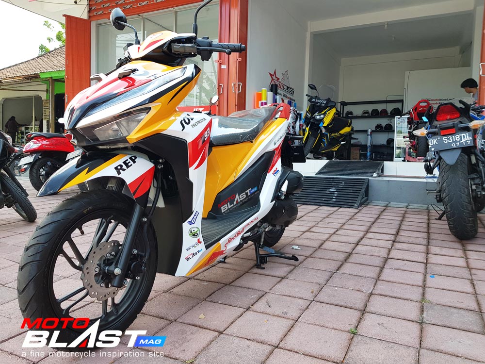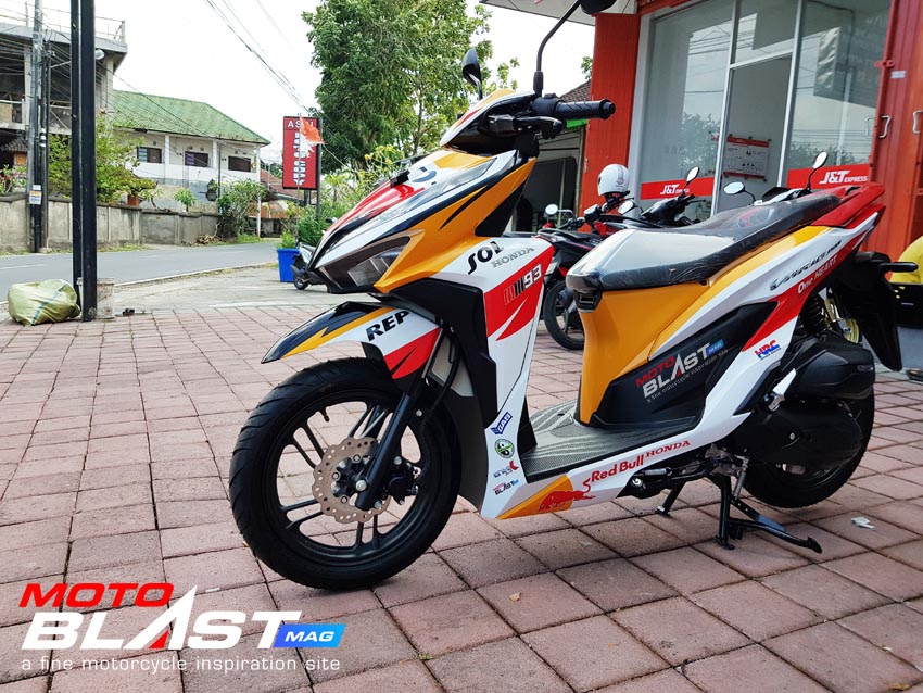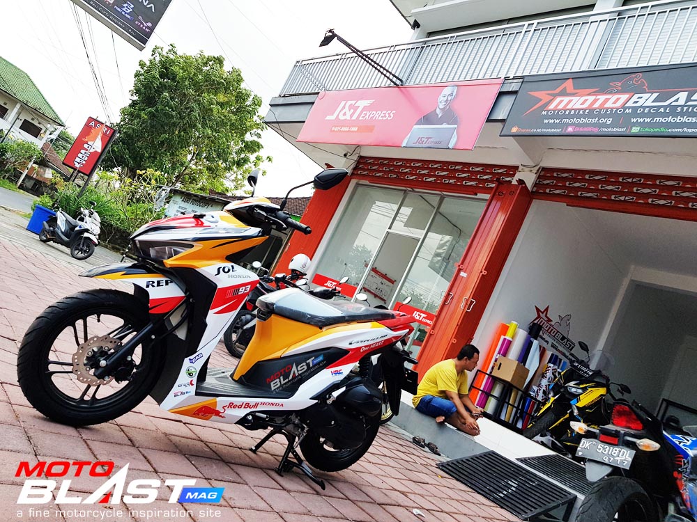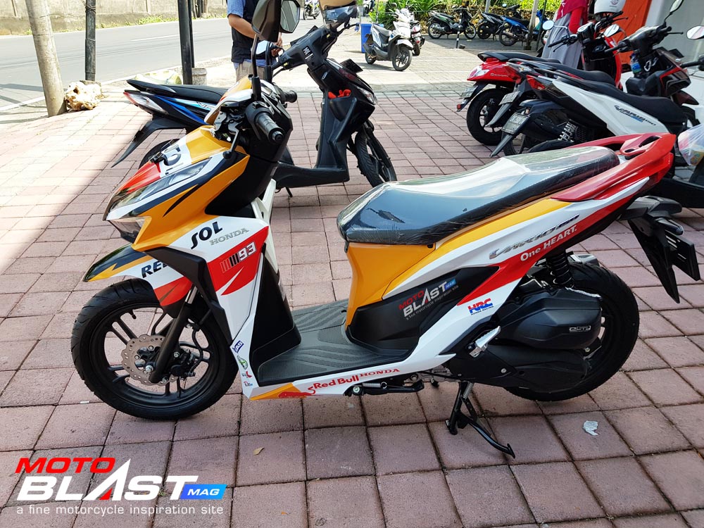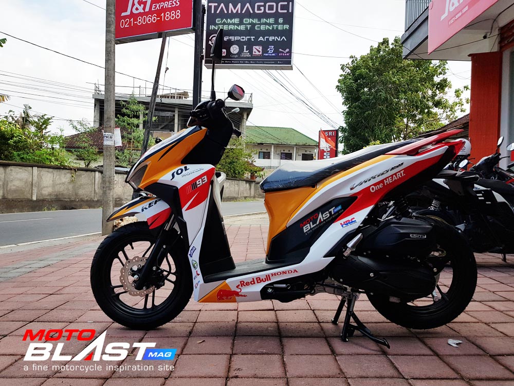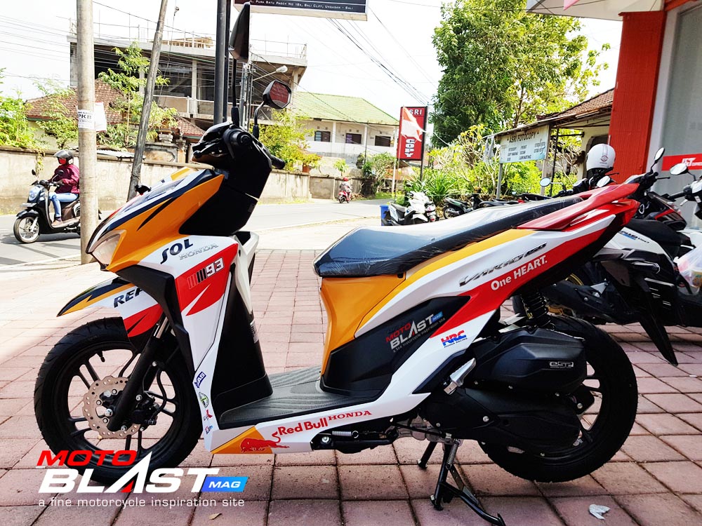 Halo mas dab.. kali ini motoblast mau share sebuah motor Vario 150 terbaru 2018 warna dasar putih yang di decal stiker livery Repsol buatan motoblast yang merupakan request dari konsumen motoblast yang langsung mengirimkan motornya ketika baru keluar dari dealer, langsung bro gak pake mampir ke empunya